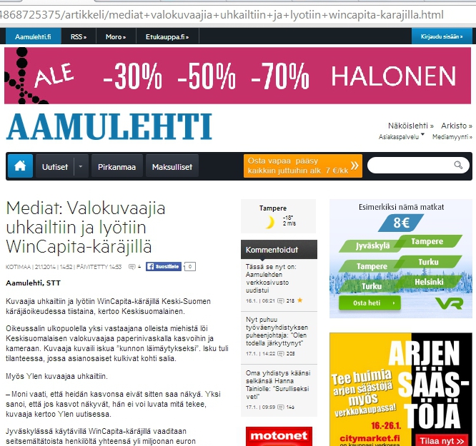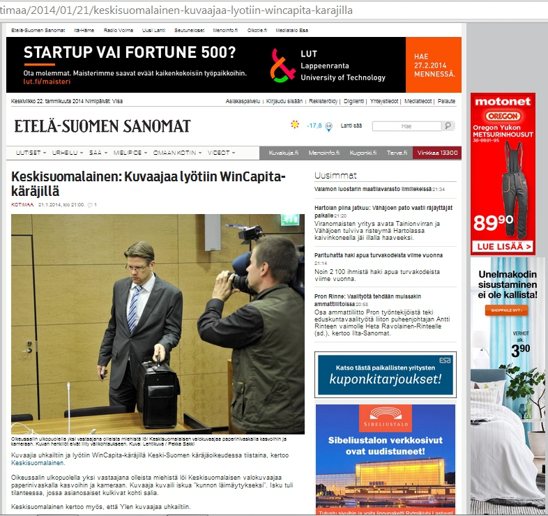 Viidellätoista sivustolla: WinCapita- käräjät: Valokuvaajia uhkailtiin ja lyötiin Keski-Suomen käräjillä Jyväskylässä. Sivukuvat Talvipyöräilyä Kuva - Anteeksianto Lue! Kauppi: Lainakaton vaikutus Lue! - 2002 Pankit eivät ota riskejä asuntolainoissa Lue! | ![]() |