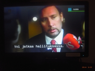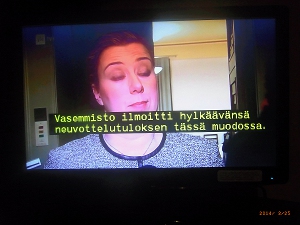 Hallituksen suuressa SOTE-tiedotustilaisuudessa olivat edustettuina kaikki eduskuntapuolueet VASEN-ryhmää lukuunottamatta. Valtiovarainministeriön säästöbudjetin johdosta pöytiä ei riittänyt kaikille. Vain Sdp:n Jutta Urpilainen, Kokoomuksen Jyrki Katainen, Perussuomalaisten Timo Soini ja Keskustan Juha Sipilä pääsivät pöydän ääreen. Kuvassa tuoleilla, joita onneksi oli riittänyt, etualalta loittonevasti: Kristillisdemokraattien Päivi Räsänen (kuuntelee), RKP:n Carl Haglund (katselee tummassa solmiossaan), Vihreitten Ville Niinistö (kirjoittaa arvokkaan näköisesti muistiinpanoja) ja Vasemmistoliiton Paavo Arhinmäki (vilkuilee vasemmalle kirjavissa sukissaan ja valkoisessa kalsarinlahkeessaan).