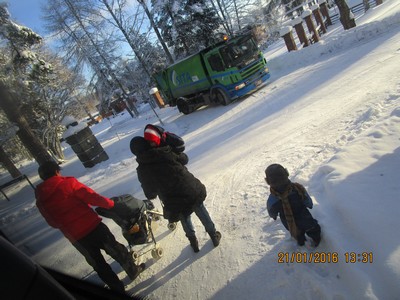 Aavarannan pakolaiskeskuksessa asuu myös perheitä. Pikkupoika ihmetteli roska-autoa ja sen mentyä hän liukasteli lumessa kunnes isä tarttui kätöseen. Äiti vei aluksi sylissään vielä pienempää.