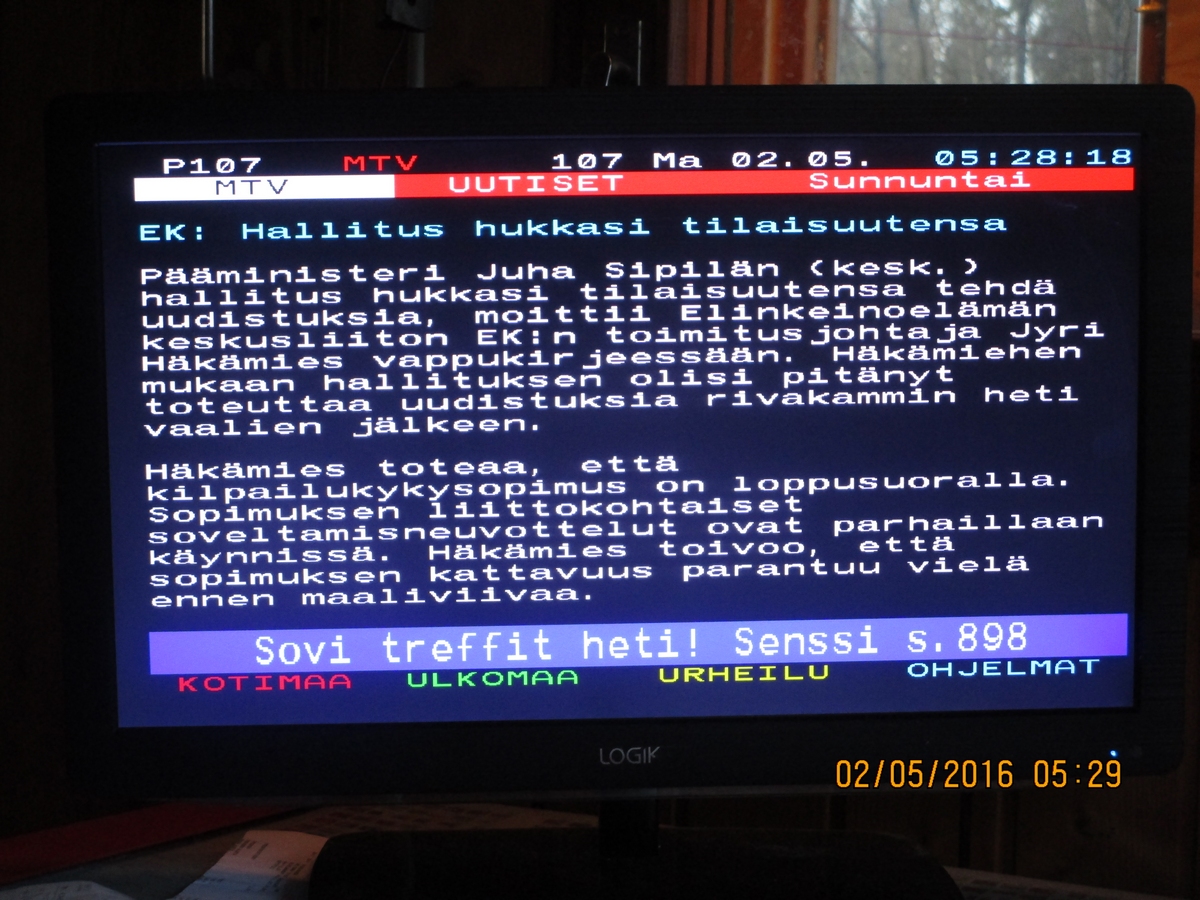 - Heti vaalien jälkeen ay-liike otti lukua, mutta toipui syksyn mittaan, kun hallitus hukkasi tilaisuutensa. Häkämies kiittää hallituksen tavoitetta laittaa talous kuntoon. Oppositiota hän nuhtelee holtittomista puheista velkaantumisen puolesta. Kilpailukykysopimuksen maali häämöttää kuun lopussa. YLE TEKSTI-TV 01.05,2016. Kuva: Pertti Manninen. MTV Ma 02.05. 05:28:18 EK: Hallitus hukkasi tilaisuutensa Pääministeri Juha Sipilän (kesk.) hallitus hukkasi tilaisuutensa tehdä uudistuksia, moittii Elinkeinoelämän keskusliiton EK:n toimitusjohtaja Jyri Häkämies vappukirjeessään. Häkämiehen mukaan hallituksen olisi pitänyt toteuttaa uudistuksia rivakammin heti vaalien jälkeen. Häkämies toteaa, että kilpailukykysopimus on loppusuoralla. Sopimuksen liittokohtaiset soveltamisneuvottelut ovat parhaillaan käynnissä. Häkämies toivoo, että sopimuksen kattavuus parantuu vielä ennen maaliviivaa. Sovi treffit heti! Senssi s.898 MTV Ma 02.05.2016 Kuva: Pertti Manninen. |