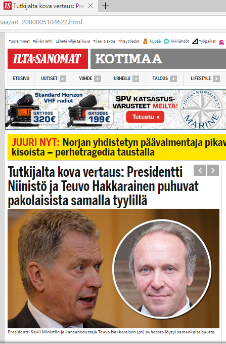 Tutkijalta kova vertaus: Presidentti Niinistö ja Teuvo Hakkarainen puhuvat pakolaisista samalla tyylillä. Ilta-Sanomat sunnuntai 26.02.2017. Lue!