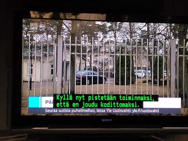 HUHTIKUU 2015. KUVA. NUORALLATANSSI MAALAISTENTALOLLA VAALITULOKSEN SELVITTYÄ YHDEN MAINOKSEN VIELÄ MUISTUTTAESSA NATOSTA JA JULKISISTA PALVELUISTA. |