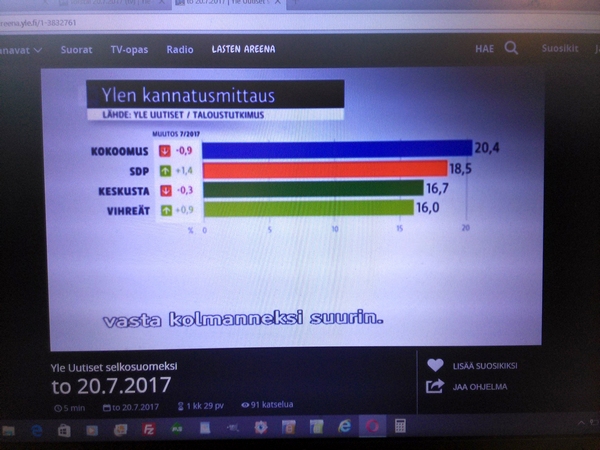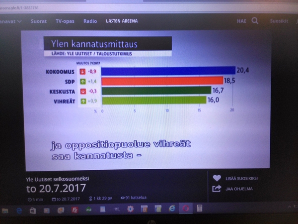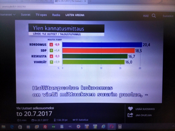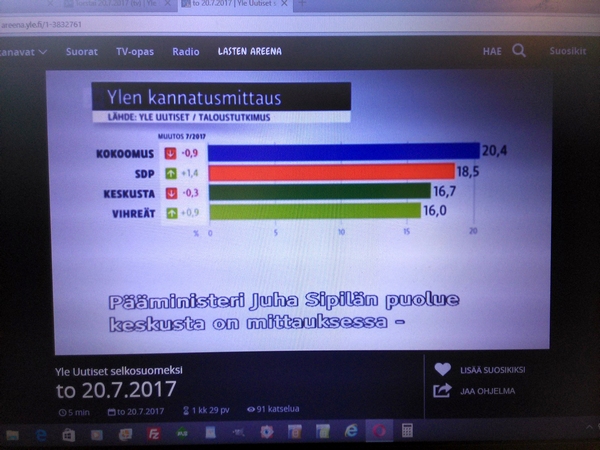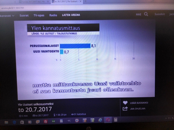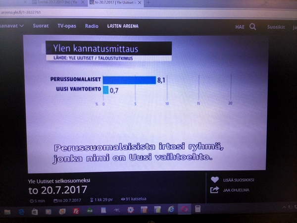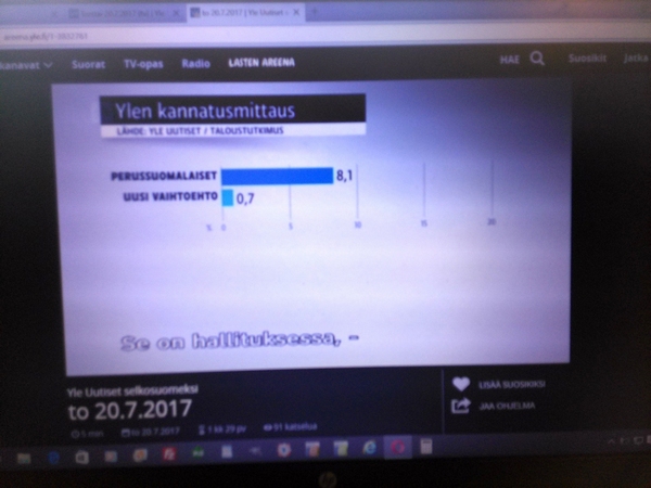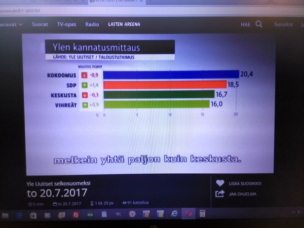 Yle:n surullinen Taloustutkimus Oy:llä teettämä "puoluekannatusarvio" Osa1 Pääkirjoitus. Olemattoman mittaaminen ei ole muuta kuin humpuukia. Tässä Ylen selkokielisen uutislähetyksen selostuksessa torstaina 20.07.2017 kerrottiin, että Perussuomalaiset-niminen puolue on hajonnut. Suruttomasti tuloksia julkistetaan, unohdetaan tavallisesti virhemarginaali ja selitetään tuloksia mutu-tuntumalla, vaikkei ko. asiaa olisi kysytty tai mitattu mitenkään. Jääköön tämä nyt esimerkiksi siitä, kuinka huonolla kysymyksenasettelulla saadaan huonoja tuloksia. Surullista. Nettisanomat. Pertti Manninen. Perjantaina 21.07.2017 13:43. |