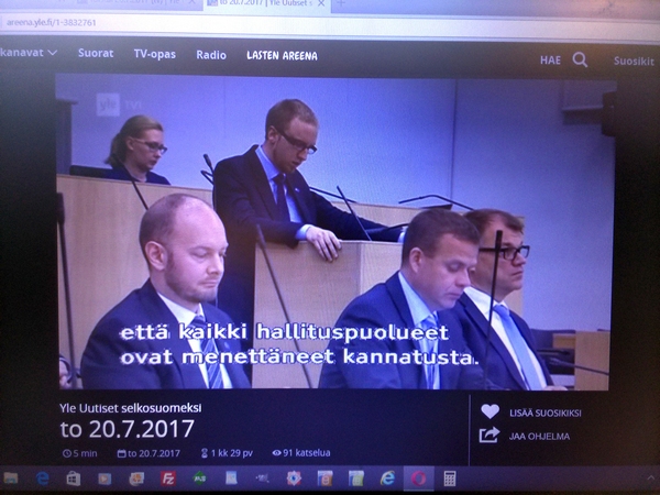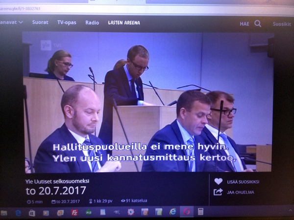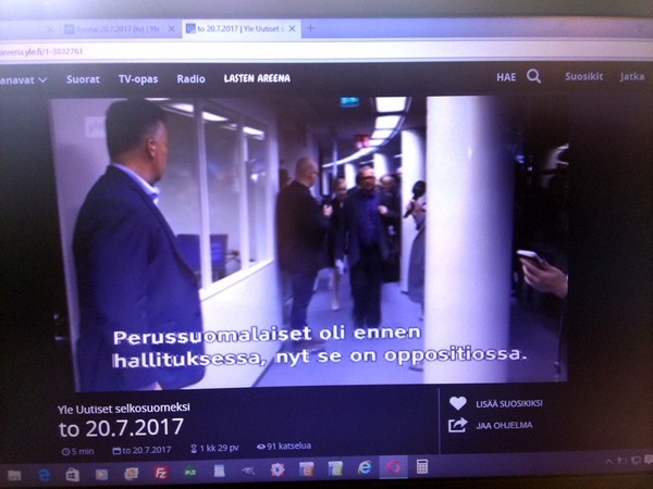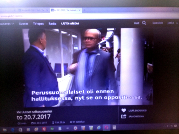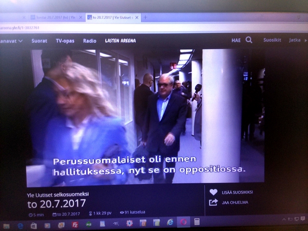 Perussuomalaisten hajoaminen. Katkelma Viikkosanomat- blogista maanantai 03.07.2017 "Kysymys on samanlainen kuin koko puolueen pirstominen. Siitäkään ei etukäteen puhuttu, jotta se voisi toteutua. Siinähän meni vain yksi asia pieleen. Jussi Halla-aho oli lukenut tai muuten selvillä Timo Soinin pari vuotta sitten MTV3:lle antamasta lausunnosta: ”Puoluehallitus voi erottaa vaikka puheenjohtajan puolueesta”. Niinpä Halla-aholaiset valloittivat koko puoluehallituksen, joten uuden puoluejohdon erottaminen kävi mahdottomaksi. Senkin Timo Soini olisi varmaankin tehnyt ja olisi näin voinut pitää puoluetukirahat itsellään. Ei tästäkään ole paljon kerrottu. Enemmäm on ollut ministeri Jari Lindströmin valitusta siitä, että ei saisi ottaa totaalista selkävoittoa. Pakkohan se oli ottaa, jotta Soinin operaatio voitiin torjua. Voi olla, että Lindström oli ulkona tästä kuviosta tai sitten ei. Selittäähän hän kyllä osaa. Viikkosanomat. Pertti Manninen. Maanantai 03.07.2017 16:03. PÄÄMINISTERI JUHA SIPILÄN TERVEHDYS YLESSÄ.