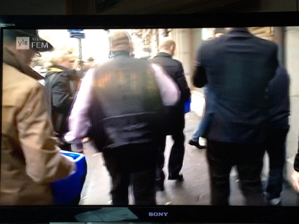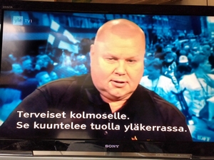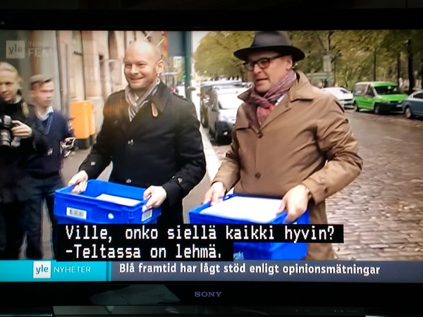 HUHTIKUU 2015. KUVA. NUORALLATANSSI MAALAISTENTALOLLA VAALITULOKSEN SELVITTYÄ YHDEN MAINOKSEN VIELÄ MUISTUTTAESSA NATOSTA JA JULKISISTA PALVELUISTA. |