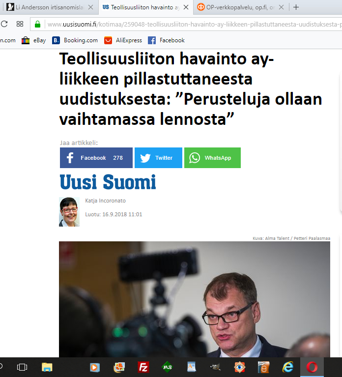 Eduskunnan hallintojohtaja keskeytti Hakkaraisen asumistuen maksamisen.Rauhio teki päätöksen, ennenkuin asia on selvitetty. Onhan kai maksaminen hänen käsissään, mutta oudolta se tuntuu , kun hän hyvin tietää, että asia on vasta tutkintavaiheessa. Aika omavaltaista ja tärkeilevää vallankäyttämistä. Viikkosanomat. Pertti Manninen, Maanantai 27.08.2018 21:43, edelleen Humppilassa. Tags: asuminen, Eduskunta, Hakkarainen, lakkauttaminen, päätös, Rauhio http://viikkosanomat.fi/2018/08/27/eduskunnan-hallintojohtaja-keskeytti-hakkaraisen-asumisruen-maksamisen/ Salasänky, salarakkaasta Iltalehdet eivät tällä kertaa julkaisseet kuvia. Hakkarainenkin edelleen mukana.Iltalehdet intoilivat ja intoilevat edelleenkin siitä, että kansanedustaja Teuvo Hakkarainen asuu saunassa. Toivottavasti ei suinkaan ihan koko aikaa, kyllä siinä kilot putoavat ja viinahöyrytkin kaikkoisivat. Nyt kun näyttää siltä, että Hakkarainen on tehnyt vuokrasopimuksen hyvässä uskossa, toisin sanoen hän ei ole tiennyt, omien sanojensa mukaan, että hänen vuokraamansa asunto, kellarihuoneisto, ei olekaan asunto vaan sauna. Pöly laskeutunee KRP:n tutkimusten jälkeen tai sitten ei. Aika näyttää. Nyt kuitenkin iltapäivälehdet ovat onnistuneet saamaan kuvia jostain varastosta, jossa lienee asuttu. Täällä on ollut Hakkaraisen ryhmätoveri asialla, edustaja Ville Vähämäki. Kun tätä sotkua seuraa, niin kyllä aamulla Iltalehden paperilehteä lukiessa aluksi näytti siltä, että lehti on saanut kuvattua Hakkaraisen saunaa. Oikein tarkkaan lukiessa kävi ilmi, että kuvat ovatkin jostain varastosta. Toimittaja edelleen hokee, että ”Hakkarainen oli myöntänyt asuneensa saunassa!”. Tätähän Hakkarainen ei ole myöntänyt vaan hän on sanonut asuneensa asunnossa, joka hänelle on vuokrattu kellarihuoneiston nimellä. Ilta-Sanomat, joka näytti jääneen toiseksi jutun selvittämisessä härskisti kopioi Iltalehden kuvat, jotka tosin ovat julkista omaisuutta. Lehti oli löytänyt lisäksi tässä ohessa olevan kuvan, jossa parivuoteessa sitten lienee nukuttu ja ehkä muutakin … Hakkaraisella ei ole osuutta tähän sänkyyn, tiettävästi, vaikka nopeasti ja tuskan kanssa näyttää siltä, että Hakkaraisella on ”puhtaat jauhot ja lakanatkin” tässä casessa. Viikkosanomat. Pertti Manninen. Humppila. Kahvila. (Kahvi ja munkki 1,50). Tiistaina 07.08.2018 11;20. Kuvan Ilta-Sanomien kuvateksti: Lisäys: Arkistokuva Teuvo Hakkaraisesta 2015 ennen valitsemistaan toisen kauden kansanedustajaksi. Vaalitilaisuus Jyväskylässä- Kuva Pertti Manninen. Tags: HS, Ilta-Sanomat, iltalehti, kellarihuoneisto, krp, kuva, parisänky, sänky, sauna, Teuvo Hakkarainen, varasto, Ville Vähämäki, vuokrasopimus |