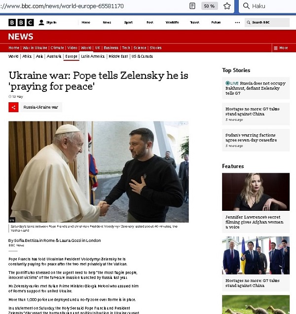 Sunnuntaina 21.5.2023. Kevään ensimmäinen. BBC NEWS 13 May Published 13 May By Sofia Bettiza in Rome & Laura Gozzi in London BBC News Pope Francis has told Ukrainian President Volodymyr Zelensky he is constantly praying for peace after the two met privately at the Vatican. The pontiff also stressed on the urgent need to help "the most fragile people, innocent victims" of the full-scale invasion launched by Russia last year. Mr Zelensky earlier met Italian Prime Minister Giorgia Meloni who assured him of Rome's support for united Ukraine. More than 1,000 police are deployed and a no-fly zone over Rome is in place. In a statement on Saturday, the Holy See said Pope Francis and President Zelensky "discussed the humanitarian and political situation in Ukraine caused by the ongoing war" during a meeting that lasted about 40 minutes. The Argentine pontiff and President Zelensky "both agreed on the need to continue humanitarian efforts to support the population". The statement added: "The Pope has assured his constant prayer and continuous invocation to the Lord for peace - since last February" - when Russian President Vladimir Putin ordered the full-scale invasion. Pope Francis has often said that the Vatican stands ready to act as a mediator in the conflict between Russia and Ukraine. Top Stories Hostages no more: G7 takes stand against China Published 5 hours ago Sudan's warring factions agree seven-day ceasefire Published 5 hours ago Features Hostages no more: G7 takes stand against China Japanese Prime Minister Fumio Kishida, gestures following a photo with President Joe Biden, Ukrainian President Volodymyr Zelenskiy, French President Emmanuel Macron, and Canadian Prime Minister Justin Trudeau Your pictures on the theme of 'springtime' https://www.bbc.com/news/world-europe-65581170 2023-05-21 18:05.