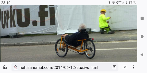 Suomalainen sitkeys. Pyöräänsä taluttaen ja kävelysauva mukanaan mies selviää arjen kauppareissuista kipeän jalan sen pahemmin vaivaamatta. Kuva |