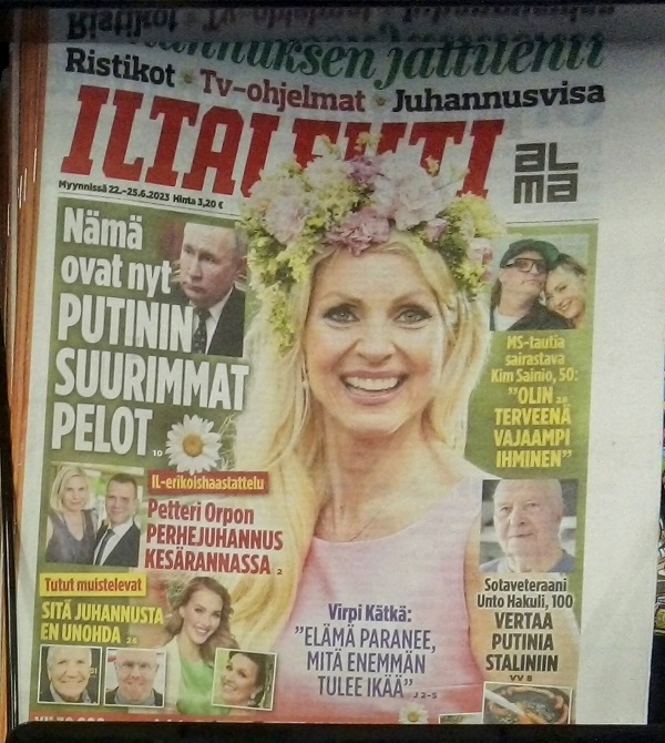 Nettisanomat - Maanantaina 26.6.2023. Kuuma kesä. "Kolmekymmentäkin taisi hetken olla." Kuva - Juhannuksen jätit. Ilta-Sanomat ja Iltalehti 2023. - 5 merkkiä: Putin voi kohta olla tuhon oma. - Nämä ovat nyt Putinin suurimmat pelot. - Vappu Pimiä. - Petteri Orpon perhejuhannus kesärannassa. - Virpi Kätkä: "Elämä paranee, mitä enemmän tulee ikää". - Sotavereraani Unto Hakuli, 100 vertaa Putinia Staliniin. Lehtitelineeltä Kirkkonummen CM:stä - Rasmus nauttii lämmöstä omassa valtakunnassaan. Kuva. - Juhannusaattona kahvia, vettä ja leipää Dawin terassilla. Kuva. - Värisuora. Petteri Orpo, pääministeri, Kok. Antti Häkkänen, puolustusministeri, Kok. Elina Valtonen, ulkoministeri, Kok. Ylen TV-uutiset lauantaina, juhannuspäivänä 24.6.2023 20:42. Kuva. - Sauli Niinistö, tasavallan presidentti. "tilanne Venäjällä, aseellinen kapina. Mistä tämä tilanne mielestänne" Ylen TV-uutiset lauantaina, juhannuspäivänä 24.6.2023 20:43. Kuva Pertti Manninen. - Talvella. Perjantai 20.1.2023. Kuukauden kuvapari. Leopard- Häkkänen. Orpon täsmennys: Muutamia. Leopard 2 -taistelupanssarivaunujen antamisesta Ukrainalle - Kokoomuksen puheenjohtaja Petteri Orpo täsmentäen lukumääräksi: "Muutamia". - Talvella. Keskiviikko 25.1.2023. Niinistö Ukrainassa. Kuvien tekstit: "En minä sodassa olevassa maassa ole ennen käynytkään.""Sauli Niinistö Borodjankassa Kiovan Alue tuhoutui viime ". --- Torstaina 22.6.2023. Vuodet vierivät. Yksi kesäkuun kuva: 1999 - 2023. --- Keskiviikkona 21.6.2023. Voikukan haituvat. - Arkisto 2014. Pääkirjoitus aitona Jussin päivänä 24.06.2014 Ministerien valintatalo. - A fantastic #Robin Concert. Kuva 2013. Stubb ja Katainen. - Nyt 2023. Viimeiset askeleet, ministereinä. Näin hallitus vaihtui - Politiikka - Ilta-Sanomat Sanna Marin (sd) käveli entisten ministerikollegoidensa Maria Ohisalon (vihr) ja Li Anderssonin (vas) kanssa kohti Presidentinlinnaa. Kuva: Lassi Rinne. Tässä rajattu osakuva. - Nyt 2023. Uusi ulkoministeri Elina Valtonen. Uusi presidentti? --- Tiistaina 20.6.2023. Petteri Orpo ja Henrietta Ylen TV1:ssä ja TV2:ssa 17:01. --- Sunnuntaina 18.6.2023. Kymmenen kuvaa. 10 kuvaa: Moto Guzzi kyläkaupalla Kuvat Riikinkukko Kuvat Mummin ruusut Kuvat Hallitusohjelma märkä päiväuni. Li Andersson Kuvat - --- Tiistaina 13.6.2023. Zlatan lopettaa. - Arkisto 2012. Kuvasarja. Jalkapallon historian mykähdyttävin maali. --- Lauantaina 10.6.2023. - 20 vuotta sitten: "Pinnan alla" Matkalla Suomessa. Yksi kuva joka kesäkuulta 2003-2023. Pertti Manninen. Kuvasarja. - The Guardian Ukraine 10 June 2023 Live Russia-Ukraine war live- - Arkisto tiistaina 22.3.2005. "Paul Wolfowitz". Kuva: Pertti Manninen. Nettisanomat lauantaina 19.03.2005. Extra! Paul Wolfowitz Maailmanpankin johtajaksi! Presidentti Bushin tekemä nimitys on provokaatio muuta maailmaa vastaan! --- Perjantaina 9.6.2023. Viikon kuva. Kirkonkylän kahvilalla. K --- Torstaina 8.6.2023. "Sireenien aikaan." --- Torstaina 1.6.2023. Opeta lapsi uimaan. Arkistokirjoitus vuodelta 2001. - Kuva. Viikon kuva. "Tyttö, sorsien sukua." --- Tiistaina 30.5.2023. Ilta-Sanomat: Jenni Haukio avautuu kipeistäkin hetkistä. Jenni Haukio avoimena suuresta surustaan. - Arkisto 2012. "URA" "Ura". Kansikuvassa Jenni Haukio ja presidentti Sauli Niinistö. Seura 18.10.2012. Torstaina 2012-12-27 13:58 Lounasravintola - Kahvila Rosannessa Laukaassa. Kuva. --- Tiistaina 30.5.2023. The Guardian. Linkit: