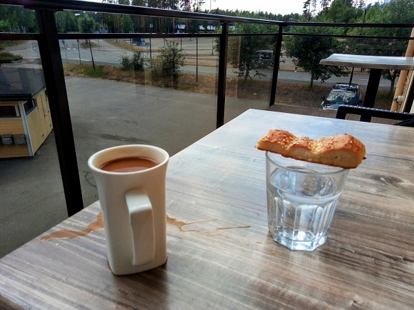 Juhannusaattona kahvia, vettä ja leipää Dawin terassilla. Uusimaa. Kirkkonummi. Veikkola. Perjantai 23.6.2023 16:26. Kuva Pertti Manninen.