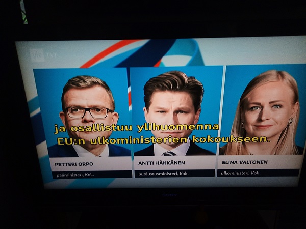 Petteri Orpo, pääministeri, Kok. Antti Häkkänen, puolustusministeri, Kok. Elina Valtonen, ulkoministeri, Kok. "ja osallistuu ylihuomenna ulkoministerien kokoukseen."
