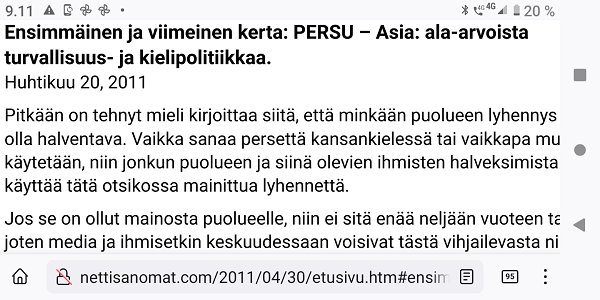 Ensimmäinen ja viimeinen kerta: PERSU – Asia: ala-arvoista turvallisuus- ja kielipolitiikkaa. Huhtikuu 20, 2011 Lue! Rasismia Vapunaattona 30.4.2011 |