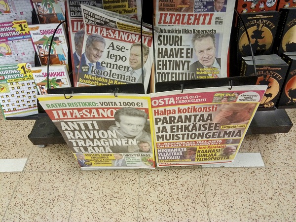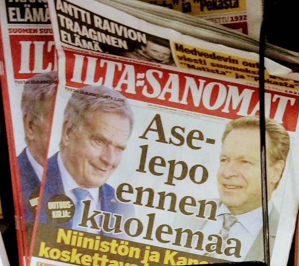 Nettisanomat - Tiistaina 15.8.2023. Tanssi yli hautojen. Tanssi yli hautojen. Ilta-Sanomat tiistaina 15.8.2023: Uutuuskirja: Aselepo ennen kuolemaa. Niinistön ja Kanervan koskettava kohtaaminen. Kuva: Uusimaa. Kirkkonummi. CM tiistaina 15.8.2023 08:59. Pertti Manninen. Pääkirjoitus. Tanssi yli hautojen. Kun vain toinen osapuoli voi kertoa kädenojennuksesta ja aselevosta niin hehkutus on aika kornia. Kuoleman hetkellä arvokkaampaa olisi ollut tehdä tilit selviksi. Aikalaiset voivat kertoa kuinka paljon Sauli Niinistö eri asemissaan kiusasi Ilkka Kanervaa, ja suorastaan vittuili julkisesti ja myös kulisseissa, joka on vielä raukkamaisempaa. RIP, Ile. Pääkirjoitus. Pertti Manninen tiistaina 15.8.2023 18:36. --- Maanantaina 14.8.2023. Jätskiautolla. Uusimaa. Kirkkonummi. Björkdalintie. Pappa pikkuisen kanssa ostamassa ison paketin. Lauantaina 12.8.2023 puolen päivän aikaan 11:33. Kuva. Pertti Manninen. - Arkisto 2011. Rasismia Vapunaattona 30.4.2011 Teuvo Hakkaraisen vaaliesite. Lue! Neekeriukko ja hurriakka. Pääkirjoitus. (Teuvo Hakkarainen, Eva Biaudet ja Matti Vanhanen) Lue! Stubb merirosvojen vapauttamisesta: "Ei se sen kummempaa ... Lue! Persusta pesuun (Jussi Niinistö) Lue! Onneksi on perussuomalaiset Lue! Pääkirjoitus lauantaina 2011-04-30 Neekeriukko ja hurriakka. Lue! Torstai 2011-04-21 Stubb epäiltyjen merirosvojen vapauttamisesta: "Ei se sen kummempaa ole" Lue! Ensimmäinen ja viimeinen kerta: PERSU – Asia: ala-arvoista turvallisuus- ja kielipolitiikkaa. Huhtikuu 20, 2011 Lue! Rasismia Vapunaattona 30.4.2011 --- Sunnuntaina 13.8.2023. Uusi sukupolvi hippasilla. Uusimaa. Kirkkonummi. Björkdal. Oravien uusi sukupolvi hippasilla kaksihaaraisessa tammessa. Sunnuntaina 13.8.2023 aamulla 08:40. Kuva. Pertti Manninen. --- Torstaina 10.8.2023. Koulut alkoivat. Matkakuvia. Linkistä Espoon Lommilassa 09:44. Mopoparkki. Kuninkaantien lukio. Espoo 11:21. Pyöräparkki. Kuninkaantien lukio. Espoo 11:23. Aulassa 11:24. Kaunottaret parkissa 13:25. Lukion uimahallista ulos tullessa. Kuva Pertti Manninen. Kirkkonummen matkakeskuksessa busseja odottaen eri puolille kyliin 13:57. Äiti saattaa pientä koululaista Kirkkonummen asemalla 13:58. 14:19 Uusimaa. Kirkkonummi. keskusta. Kirjasto Fyyri. Ei ikkunoita etelään ja torille. Vanha seinä on peitetty tällä kupariunelmalla. Kahvilassa on tosi pimeää. uudessa korkeassa osassa on sentään ikkunarivi itään ja valaisimiakin tarpeeksi. Valoisa tunnelma kyllä täällä kirjojen puolella on. Torstaina 10.8.2023 15:22. Kuvat. Pertti Manninen. Koulut alkoivat. Matkakuvia. - 20 vuotta sitten 7.8.2003 - Käden ojennus. Kuva - Saddamin poikien hautajaiset. Lue! - Saddamin jahti. Lue! - Halonen sai Loviisan rauhanpalkinnon. Lue! --- Talous. Kone sai Partekin puoli-ilmaiseksi. --- Rallikuvia 2011. --- Maanantaina 31.7.2023. Mansikkakakku. Mansikkakakku. 11 -. - Koistinen. "En minä tähän kuole." Viimeinen repliikki Aki Kaurismäen elokuvassa Laitakaupungin valot. --- Torstaina 27.7.2023. LIIAN PAKSUA! Pääkirjoitus. Pertti Manninen torstaina 27.7.2003 19:01. --- Torstaina 27.7.2023. Liian paksua. Pääkirjoitus. --- Maanantaina 24.7.2023. Sateenkaari. Kuva. - 20 vuotta sitten 24.7.2003. Pääkirjoitus torstaina 24.07.2003. --- Lauantaina 22.7.2023. Synkkä päivä? Sadekuuro yllättää? Kuva - Länsiväylällä Paikalliset. Kysely. - Länsiväylä keskiviikkona 19.7.2023. Länsiväylän toimitus sanoutuu irti kaikenlaisesta rasismista. - Nettisanomat. Pääkirjoitus Arkipäivän rasismia. Tasavallan presidentti Sauli Niinistö on nimittänyt tämän Petteri Orpon hallituksen, josta jo yksiministeri, Vilhelm Junnila, on joutunut eroamaan natsismisyytösten takia ja toista Riikka Purraa vaaditaan eroamaan rasismisyytösten johdosta. ... Arkipäivän rasismia voi harjoittaa sanoissa ja teoissa, molemmissa karkeasti tai sitten hienostuneesti. --- Maanantaina 17.7.2023. Kesäistä Suomesta. Alastomuutta. Alastonkuvausta Kuopiossa. - Kevennystä. Kesäteatteria Lappeenrannassa. Kyyttöjä. - Maanantaina 17.7.2023. 20 vuotta sitten 17.7.2003. Irak-vuoto. Asiakirjat. 11.3.2003. Ilta-Sanomat. 11.3.2003. Iltalehti. 12.3.2003. Ilta-Sanomat. 12.3.2003. Iltalehti. 8.5.2003. Ilta-Sanomat. Uusia! Poliisi tutkii näitä sivuja. . Ilta-Sanomat 11.3.2003. Salainen raportti Lipposen vierailusta Washingtonissa. Bush kiitti Suomea "liittymisestä koalitioon." --- Torstaina 13.7.2023. Biden. Fyyri. Kurpitsa. - - Maanantaina 10.7.2023. 20 vuotta sitten 10.7.2003. Keskustan kannatus noussut viikossa peräti 1,5 prosenttiyksikköä! --- Maanantaina 10.7.2023. Kesällä maustetaan Frans maustaa --- Sunnuntaina 9.7.2023. Arkisto. tiistaina 17.6.2003. Keskisuomalainen. Jyväskylä, Anne Laitinen. Johan Galtung näkee poispääsyn loputtomasta terrorismin kierteestä. --- Nettisanomat 20 vuotta sitten 3.7.2003. Lauantaina 8.7.2023. Satoa odottaen. - 20 vuotta sitten 3.7 (loppu). --- Torstaina 6.7.2023. Eino Leino 145 vuotta. - Tervetuloa ILTA-SANOMAT 6.7.2023 - . Saamelaiskirjailija Niillas Holmbergille Eino Leinon palkinto: --- Maanantaina 3.7.2023. Kesäyön lintu. Kuva. - Nettisanomat 20 vuotta sitten 3.7.2003. Helsingin Sanomat jäi valheesta kiinni! HS-Gallup 15.06.2003. --- Perjantaina 30.6.2023. Harrikat kesässä. --- Torstaina 29.6.2023. Tervetuloa Välkommen ILTA-SANOMAT --- Tiistaina 27.6.2023. Venäläiset tulevat? - Värisuora. Petteri Orpo, pääministeri, Kok. Antti Häkkänen, puolustusministeri, Kok. Elina Valtonen, ulkoministeri, Kok. Kuva. - Sauli Niinistö, tasavallan presidentti. - - Nyt 2023. Uusi ulkoministeri Elina Valtonen. Uusi presidentti? --- Tiistaina 20.6.2023. Petteri Orpo ja Henrietta Ylen TV1:ssä ja TV2:ssa 17:01. --- Sunnuntaina 18.6.2023. Kymmenen kuvaa. 10 kuvaa: Moto Guzzi kyläkaupalla Kuvat Riikinkukko Kuvat Mummin ruusut Kuvat Hallitusohjelma märkä päiväuni. Li Andersson Kuvat - --- Tiistaina 13.6.2023. Zlatan lopettaa. - --- Lauantaina 10.6.2023. - 20 vuotta sitten: "Pinnan alla" - Ukraine 10 June 2023 - Ark