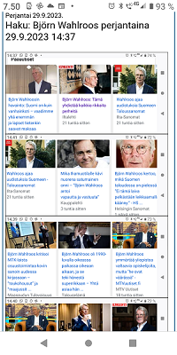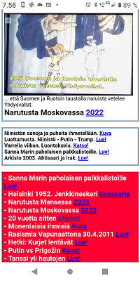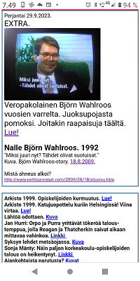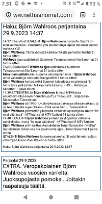 Nettisanomat - Lauantai 30.9.2023. Nettisanomat lauantai 2006-11-11. Legenda: "Jos sä olet niin helvetin fiksu, niin miksi sä olet niin helvetin köyhä." Henrik Kuningas. Nyt 2006: "Pörssissä Sammon osake kallistui torstaina lähes kahdeksan prosenttia. Seurauksena Wahlroosin osakeomistuksen arvo kasvoi 208 miljoonasta eurosta 224 miljoonaan euroon." Helsingin Sanomat perjantaina 2006-11-10. Kuva: "Super Nova". Pertti Manninen. Juhani Niirasen kuva. Pääkirjoitus. Vaurastumisesta tulee tehdä hyve eikä sitä tule tulkita "riistoksi". Paljastetaan kuka näin sanoi ja siinä sivussa jonkinlainen raapaisu valtionyhtiöiden hävittämisestä eli yksityistämisestä. Kymmeniä henkilöitä kymmenissä kirjoituksissa, nimiä Koivistosta lähtien! Mukana myös Suomen taloushistorian kavalin ja peitellyin pelastusoperaatio, Suomen Yhdyspankin omaisuuden siirtäminen turvaan. Aivoina Björn Wahlroos ja Ahti Hirvonen Lue! --- Perjantai 29.9.2023. EXTRA. Veropakolainen Björn Wahlroos vuosien varrelta. Juoksupojasta pomoksi. Joitakin raapaisuja täältä. Lue! Nalle Björn Wahlroos. 1992 "Miksi juuri nyt? Tähdet olivat suotuisat." Kuva. Björn Wahlroos-story. 18.8.2009. - Haku: Björn Wahlroos perjantaina 29.9.2023 14:37. - Perjantai 29.9.2023. EXTRA. Veropakolainen Björn Wahlroos vuosien varrelta. Juoksupojasta pomoksi. Joitakin raapaisuja täältä. Nalle Björn Wahlroos. 1992 "Miksi juuri nyt? Tähdet olivat suotuisat." Kuva. Björn Wahlroos-story. 18.8.2009. - 12.8.1999. "... pitkitti juuri sopivasti konkurssiinmenoa niin, että silloinen Suomen Yhdyspankki (SYP) onnistui turvaamaan itselleen ja konkurssin ulkopuolelle 300 miljoonan saatavansa. Kauppa- ja teollisuusministeriön kansliapäällikkönä oli tapahtumahetkellä Bror Wahlroos ja Suomen Yhdyspankin eräänä johtajana hänen poikansa Björn Wahlroos." Alho- Sundqvist II: Ministeri Tuomioja armahti ex-ministeri Suomisen pääministeri Lipposen ja ministeri Niinistön hymistessä taustalla. . - 18.11.1999. "Tahallinen hämäys keskustelussa 1: Pankkituki ei ollut pankkien tukea vaan pankkien omistajien tukea! Tahallinen hämäys keskustelussa 2: Voutilainen huonojen asiakkaiden puhe oli tarkoin ajoitettu juoni: Ruvettiin keskustelemaan lillukanvarsista!" Pankinomistajien tuki. - 20.5.2004. "Pankki oli matkalla kohti loppuaan, osakkeenomistajien rahat ja omaisuudet olivat vaarassa. ... Johtokunnan jäsenet Ahti Hirvonen ja Björn Wahlroos lukivat madonlukuja ja johtivat puhetta. Lopuksi esitettiin Suomen taloushistorian kavalin ja peitellyin pelastusoperaatio, oli turvattava paikallaolijoiden ja muidenkin pankkien suuromistajien osakkeet ja omistukset. " TALOUSARVIO YLE. Radio perjantaina 14.05.2004 SEPPO KONTTINEN. - 11.11.2006. Otsikko: Sampo Pankki myytiin Tanskaan. Sampo-konsernilla on nyt kassassa irtorahaa 5 miljardia. Wahlroos: Suomen suurin käteiskauppa. Konserniin jäävät vakuutusyhtiö If ja Henki Sampo. Kuvateksti: Sammon konsernijohtaja Björn Wahlroos esitteli eilen tyytyväisenä Danske Bankin kanssa tehtyä kauppaa. Wahlroosin oman Sampo-omistuksen arvo kasvoi torstaina 208 miljoonasta eurosta 224 miljoonaan euroon.Legenda: "Jos sä olet niin helvetin fiksu, niin miksi sä olet niin helvetin köyhä." Henrik Kuningas. 11.11.2006. JATKUU? --- Keskiviikkona 27.9.2023. Päivälleen 24 vuotta sitten: Katujuopottelu kuriin Helsingissä! Viina virtaa vain aidan sisäpuolella? Lue! - 24 vuotta sitten: torstaina elokuun 12. päivänä 1999 Köyhät opiskelijat, painukaa helvettiin! Ette maksa tarpeeksi pankinomistajien tukea! "Kokoomuksen lähtökohtana on ollut tiukka budjettilinja." Ben Zyskowicz, kokoomuksen eduskuntaryhmän puheenjohtaja lue lisää leikkauksista "Yksilöön näin voimakkaasti kohdistuville leikkauksille saa totisesti etsiä vertailukohtia sosiaaliturvamme historiasta." "Jos leikkaus toteutetaan, menettää opiskelijaperhe pahimmillaan yli 7000 markaa vuodessa, keskimäärinkin pitkälti yli 4000 markkaa. Vertti Kiukas, Helsingin yliopiston ylioppilaskunnan hallituksen jäsen lue lisää hallitusohjelmapetoksesta "Pienetkin leikkaukset tuntuvat opiskelijan kukkarossa pahalta, mutta kaikki on suhteellista." Helsingin Sanomien pääkirjoitus, (lehden vastaava päätoimittaja on Janne Virkkunen). lue lisää leikkauksista. ---Tiistaina 26.9.2023. Lähtöä odottaen. Joutsenet pellolla. Uusimaa. Kirkkonummi. Lapinkylä. Maanantai 25.9.2024 15:33. Kuva Pertti Manninen. - Kommentti: Orpo ja Purra yrittävät tökeröä taloustemppua, jolla Reagan ja Thatcherkin saivat aikaan mittavaa vahinkoa. Lue! Kommentti. Jan Hurri. Ilta-Sanomat Taloussanomat Sunnuntai 24.9.2023. Lue! "Tulonsiirrot köyhiltä rikkaille ovat tökeröä politiikkaa, mutta ne eivät ole Orpon tai Purran keksintöä. Samaa kokeilivat jo 1980-luvun ”suuret talous-uudistajat" Reagan ja Thatcher – surkein seurauksin." --- Sunnuntaina 24.9.2023. Syksyn lehdet metsäojassa. Lehdet ja risut odottavat talvea ja kevättä muhentaakseen uutta voimaa seuraavalle kesälle. Uusimaa. Kirkkonummi. Lapinkylä. Sunnuntai 24.9.2024 15:18. Kuva Pertti Manninen. - Näin paljon korkeakoulu- opiskelijoiden talous on heikentynyt: Yliopistoja valtaavien opiskelijoiden huoli on aito. Uusi Suomi. Kommentti. Sonja Mänty. Lue! --- Perjantaina 22.9.2023. Ajankohtaista narutusta? Narutusta Mansessa 2023 Narutusta Moskovassa 2022. - Keskiviikkona 20.9.2023. KALTSIN KALTSIT Valokuvaaja Aulis Nyqvist järjesti kirjaimet riviin ja niin syntyi slangikirja "KALTSIN KALTSIT (Bammailua Kaltsista) tunnelmiin liittyvin valokuvin. - HS: Kirjailija Torsti Lehtinen kuollut Kirjailija, filosofi ja kääntäja Torsti Lehtinen on kuollut lauantaina Helsingissa. Lehtinen oli 81-vuotias. Ylen tekstitv tiistaina 19.9.2023 16:20 Tuuli käy heidän ylitseen. RIP Torsti. Pertti Manninen. - Keskiviikkona 20.9.2023. Niinistön sanoja ja puheita tulkitaan ja ihmetellään. Ilta-Sanomat tiistai 19.9.2023 Venäjän media kuhisee ERIKOISIA TULKINTOJA NIINISTÖN SANOISTA Iltalehti tiistai 