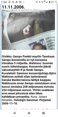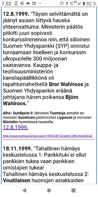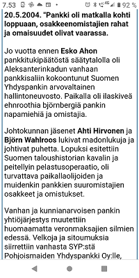 Mistä ahneus alkoi? 12.8.1999. "Täysin selvittämättä on jäänyt asiaan liittyvä hauska yhteensattuma: Ministerin päätös pitkitti juuri sopivasti konkurssiinmenoa niin, että silloinen Suomen Yhdyspankki (SYP) onnistui turvaamaan itselleen ja konkurssin ulkopuolelle 300 miljoonan saatavansa. Kauppa- ja teollisuusministeriön kansliapäällikkönä oli tapahtumahetkellä Bror Wahlroos ja Suomen Yhdyspankin eräänä johtajana hänen poikansa Björn Wahlroos." http://www.nettisanomat.com/1999/08/12/netti1208.htm#alho2 18.11.1999. "Tahallinen hämäys keskustelussa 1: Pankkituki ei ollut pankkien tukea vaan pankkien omistajien tukea! http://www.nettisanomat.com/1999/11/18/n9916pankit2.htm 20.5.2004. "Pankki oli matkalla kohti loppuaan, osakkeenomistajien rahat ja omaisuudet olivat vaarassa. Johtokunnan jäsenet Ahti Hirvonen ja Björn Wahlroos lukivat madonlukuja ja johtivat puhetta. Lopuksi esitettiin Suomen taloushistorian kavalin ja peitellyin pelastusoperaatio, oli turvattava paikallaolijoiden ja muidenkin pankkien suuromistajien osakkeet ja omistukset. Vanhan ja kunnianarvoisen pankin yhtiöjärjestys muutettiin huomaamatta veronmaksajien silmien edessä. Velkoja ja sitoumuksia siirrettiin vanhasta SYP:stä Pohjoismaiden Yhdyspankki Oy:lle, joka kas kummaa muutti nimensä heinäkuussa vuonna 91 Suomen Yhdyspankiksi. Vanha ja kunnianarvoisa entinen SYP se muutettiin Unitas Oy:ksi. Uudelle yhtiölle roskapankki SYP:lle jäivät sekkitilit myös yleiseen liikenteeseen lasketut velkakirjat, sekä ulkomaiset että kotimaiset, ne siirrettiin tälle susipankille." Seppo Konttinen Ylen Talousarvio-lähetyksessä perjantaina 14.05.2004. Ohjelman nimi oli Pankkivangit." "... mutta annetaan syp:n silloisen pääjohtaja ahti hirvosen todistaa ja sitten perustettiin uusi liikepankki jolleka tää vanha nimi annettiin ja pankkitoiminta siirrettiin sille sille tuota uudelle yhdyspankille ja tästä tuli holding-yhtiö tälle tuota konsernille tästä liikepankki unitas oy:stä ja sitten se seuraavana vuonna luopui liikepankkioikeuksistaan ja siitä tuli tavallinen yhtiö ja näinollen sitten se ei tarvinnut enää hallintoneuvostoa vaan sille muodostettiin normaali ulkopuolinen hallitus seppo konttinen mutta ahti hirvonen ilmotettiinko tästä pelastusoperaatiosta nimenmuutoksesta ja yhtiöjärjestyksen muutoksista tallettajille velkojille ja velallisille http://www.nettisanomat.com/2004/05/20/pankkivankituki.htm 11.11.2006. Legenda: