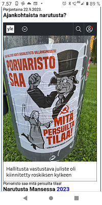 Maanantaina 4.9.2023. Alas hallitus! Kohti sosialistista vallankumousta! Kansanedustaja Pauli Kiuru kieltäisi Tampereella levitetyn julisteen, koska hänen mielestään siinä sirppi ja vasara kiihottavat väkivaltaan. Lue lisää! "... että Suomen ja Ruotsin taustalla naruista vetelee Yhdysvallat." Perjantai 26.8.2022. "Tämä on rautaesirippu." ... Suomen ja Ruotsin taustalla naruista vetelee Yhdysvallat. Kuvasarja |