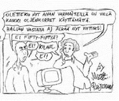 Nettisanomat - Perjantai 6.10.2023. 20 vuotta sitten 25.9.2003. Moe haluatko miljönääriksi ohjelman juontajana. By Matti Reijonen - Hei vaan kaikille myös sinne kotikatsomoihin. Koska Lasse Lehtinen ei päässyt tänne tänään työvoimatoimisto järkkäsi minut tilalle. - Ja sitten ensimmäiseen kysymykseen. Herra Manninen haluatteko miljonääriksi? A) Kyllä B) Ei C) En tiedä vai D) Kanasalaatti. - A) Kyllä. - Oletteko nyt aivan varma? Teillä on vielä kaikki oljenkorret käyttämättä. - Haluan vastata A) älkää nyt viittikö! - Ei fifty-fiftyä? - Ei! - Kilaut... - Ei!. Moe 20 vuotta sitten: 2.10.2023 - 3.10.2023 - 4.10.2023 - 5.10.2023 - 6.10.2023 - --- 20 vuotta sitten 2.10.2003. Pääkirjoitus. Puhetta. "Hyvät maanmiehet, tilanne on vakava. - Pääkirjoituksia. Linkit --- Sunnuntai 1.10.2023. Kurjet lentävät. Kurjet lentävät. Vain äänikonsertti auttoi näkemään korkealla lentävät linnut metsäpolun siimeksessä. Uusimaa. Kirkkonummi. Lapinkylä. Sunnuntai 1.10.2023 17:14. Kuva Pertti Manninen. --- Lauantai 30.9.2023. Nettisanomat lauantai 2006-11-11. Legenda: "Jos sä olet niin helvetin fiksu, niin miksi sä olet niin helvetin köyhä." Henrik Kuningas. Nyt 2006: "Pörssissä Sammon osake kallistui torstaina lähes kahdeksan prosenttia. - Kuva: "Super Nova". Pertti Manninen. - Pääkirjoitus. Vaurastumisesta tulee tehdä hyve eikä sitä tule tulkita "riistoksi". - Mukana myös Suomen taloushistorian kavalin ja peitellyin pelastusoperaatio, Suomen Yhdyspankin omaisuuden siirtäminen turvaan. Aivoina Björn Wahlroos ja Ahti Hirvonen Lue! --- Perjantai 29.9.2023. EXTRA. Veropakolainen Björn Wahlroos vuosien varrelta. Juoksupojasta pomoksi. Joitakin raapaisuja täältä. Lue! Nalle Björn Wahlroos. 1992 "Miksi juuri nyt? Tähdet olivat suotuisat." Kuva. Björn Wahlroos-story. 18.8.2009. - 12.8.1999. "... pitkitti juuri sopivasti konkurssiinmenoa niin, että silloinen Suomen Yhdyspankki (SYP) onnistui turvaamaan itselleen ja konkurssin ulkopuolelle 300 miljoonan saatavansa. Kauppa- ja teollisuusministeriön kansliapäällikkönä oli tapahtumahetkellä Bror Wahlroos ja Suomen Yhdyspankin eräänä johtajana hänen poikansa Björn Wahlroos." . - 18.11.1999. "Tahallinen hämäys keskustelussa 1: Pankkituki ei ollut pankkien tukea vaan pankkien omistajien tukea! Tahallinen hämäys keskustelussa 2: Voutilainen huonojen asiakkaiden puhe oli tarkoin ajoitettu juoni: Ruvettiin keskustelemaan lillukanvarsista!" Pankinomistajien tuki. - 20.5.2004. "Pankki oli matkalla kohti loppuaan, osakkeenomistajien rahat ja omaisuudet olivat vaarassa. ... Johtokunnan jäsenet Ahti Hirvonen ja Björn Wahlroos lukivat madonlukuja ja johtivat puhetta. Lopuksi esitettiin Suomen taloushistorian kavalin ja peitellyin pelastusoperaatio, oli turvattava paikallaolijoiden ja muidenkin pankkien suuromistajien osakkeet ja omistukset. " TALOUSARVIO YLE. Radio perjantaina 14.05.2004 SEPPO KONTTINEN. - 11.11.2006. Otsikko: Sampo Pankki myytiin Tanskaan. Sampo-konsernilla on nyt kassassa irtorahaa 5 miljardia. Wahlroos: Suomen suurin käteiskauppa. Konserniin jäävät vakuutusyhtiö If ja Henki Sampo. Kuvateksti: Sammon konsernijohtaja Björn Wahlroos esitteli eilen tyytyväisenä Danske Bankin kanssa tehtyä kauppaa. Wahlroosin oman Sampo-omistuksen arvo kasvoi torstaina 208 miljoonasta eurosta 224 miljoonaan euroon.Legenda: "Jos sä olet niin helvetin fiksu, niin miksi sä olet niin helvetin köyhä." Henrik Kuningas. 11.11.2006. JATKUU? --- Keskiviikkona 27.9.2023. Päivälleen 24 vuotta sitten: Katujuopottelu kuriin Helsingissä! Viina virtaa vain aidan sisäpuolella? Lue! - 24 vuotta sitten: torstaina elokuun 12. päivänä 1999 Köyhät opiskelijat, painukaa helvettiin! Ette maksa tarpeeksi pankinomistajien tukea! "Kokoomuksen lähtökohtana on ollut tiukka budjettilinja." Ben Zyskowicz, kokoomuksen eduskuntaryhmän puheenjohtaja lue lisää leikkauksista "Yksilöön näin voimakkaasti kohdistuville leikkauksille saa totisesti etsiä vertailukohtia sosiaaliturvamme historiasta." "Jos leikkaus toteutetaan, menettää opiskelijaperhe pahimmillaan yli 7000 markaa vuodessa, keskimäärinkin pitkälti yli 4000 markkaa. Vertti Kiukas, Helsingin yliopiston ylioppilaskunnan hallituksen jäsen lue lisää hallitusohjelmapetoksesta "Pienetkin leikkaukset tuntuvat opiskelijan kukkarossa pahalta, mutta kaikki on suhteellista." Helsingin Sanomien pääkirjoitus, (lehden vastaava päätoimittaja on Janne Virkkunen). lue lisää leikkauksista. ---Tiistaina 26.9.2023. Lähtöä odottaen. Joutsenet pellolla. Uusimaa. Kirkkonummi. Lapinkylä. Maanantai 25.9.2024 15:33. Kuva Pertti Manninen. - Kommentti: Orpo ja Purra yrittävät tökeröä taloustemppua, jolla Reagan ja Thatcherkin saivat aikaan mittavaa vahinkoa. Lue! Kommentti. Jan Hurri. Ilta-Sanomat Taloussanomat Sunnuntai 24.9.2023. Lue! "Tulonsiirrot köyhiltä rikkaille ovat tökeröä politiikkaa, mutta ne eivät ole Orpon tai Purran keksintöä. Samaa kokeilivat jo 1980-luvun ”suuret talous-uudistajat" Reagan ja Thatcher – surkein seurauksin." --- Sunnuntaina 24.9.2023. Syksyn lehdet metsäojassa. Lehdet ja risut odottavat talvea ja kevättä muhentaakseen uutta voimaa seuraavalle kesälle. Uusimaa. Kirkkonummi. Lapinkylä. Sunnuntai 24.9.2024 15:18. Kuva Pertti Manninen. - Näin paljon korkeakoulu- opiskelijoiden talous on heikentynyt: Yliopistoja valtaavien opiskelijoiden huoli on aito. Uusi Suomi. Kommentti. Sonja Mänty. Lue! --- Perjantaina 22.9.2023. Ajankohtaista narutusta? Narutusta Mansessa 2023 Narutusta Moskovassa 2022. - Keskiviikkona 20.9.2023. KALTSIN KALTSIT Valokuvaaja Aulis Nyqvist järjesti kirjaimet riviin ja niin syntyi slangikirja "KALTSIN KALTSIT (Bammailua Kaltsista) tunnelmiin liittyvin valokuvin. - HS: Kirjailija Torsti Lehtinen kuollut Kirjailija, filosofi ja kääntäja Torsti Lehtinen on kuollut lauantaina Helsingissa. Lehtinen oli 81-vuotias. Ylen tekstitv tiistaina 19.9.2023 16:20 Tuuli käy heidän ylitseen. RIP To