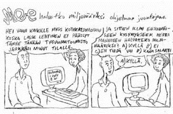 Perjantai 6.10.2023. Moe haluatko miljönääriksi ohjelman juontajana. http://www.nettisanomat.com/2003/09/18/sarjakuvamoe.htm Arkisto. 20 vuotta sitten torstaina 18.9.2003. Moe 20 vuotta sitten: 2.10.2023 - 3.10.2023 - 4.10.2023 - 5.10.2023 - 6.10.2023 - |