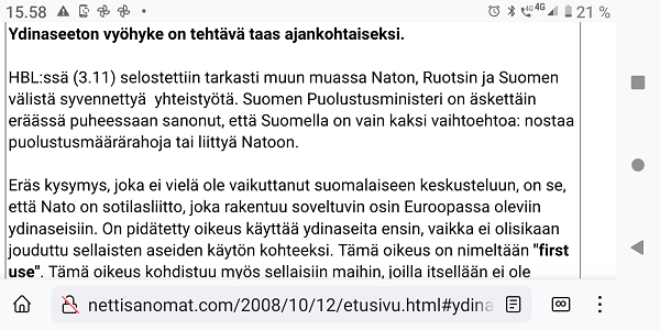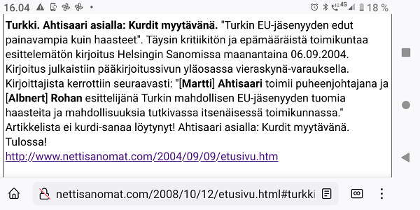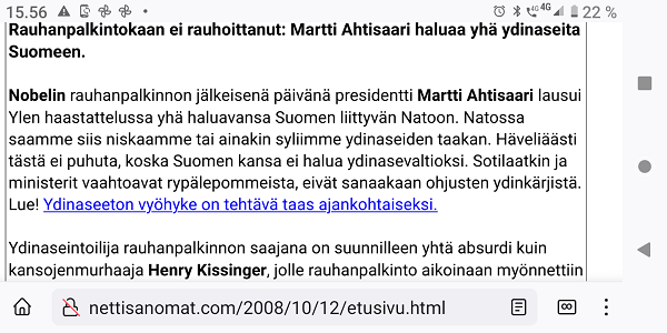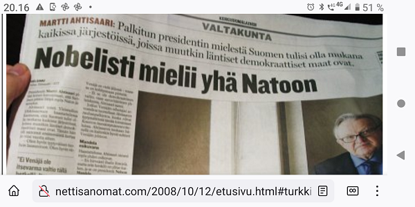 Sunnuntai 8.10.2023. Pääkirjoitus sunnuntaina 2008-10-12. Rauhanpalkintokaan ei rauhoittanut: Martti Ahtisaari haluaa yhä ydinaseita Suomeen. HBL Hufvudstadsbladet. Debatt. Nato. Aktualisera en kärnvapenfri zon igen. Stig Gustafsson. Curt Riberdahl. Tisdag 21 november 2006. (Käännös: Pertti Manninen). Ydinaseeton vyöhyke on tehtävä taas ajankohtaiseksi. Muut lehdet. Keskisuomalainen, ulkomaat perjantaina 29.11.2002. Washington, STT Bush nostaa Henry Kissingerin, 79, takaisin politiikan parrasvaloihin Ahtisaari ei kaipaa todisteita. "Tietäen, että noin miljoona ihmistä on tapettu Irakin hallinnon toimesta, minä en paljon niitä joukkotuhoaseita enää tarvitse." Helsingin Sanomat perjantaina 01.08.2003. Turkki. Ahtisaari asialla: Kurdit myytävänä. "Turkin EU-jäsenyyden edut painavampia kuin haasteet". Täysin kritiikitön ja epämääräistä toimikuntaa esittelemätön kirjoitus Helsingin Sanomissa maanantaina 06.09.2004. Albaaaniperheelle Ahtisaari on rauhantekijä. Nobelisti mielii yhä Natoon Linkkejä ja kirjoituksia. 35 kpl http://www.nettisanomat.com/2008/10/12/etusivu.html#linkkeja |