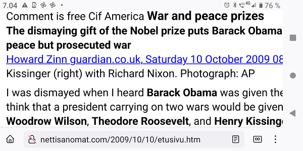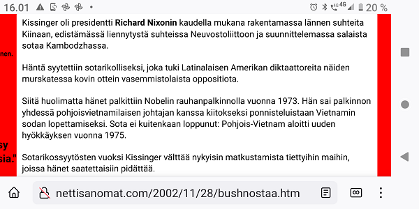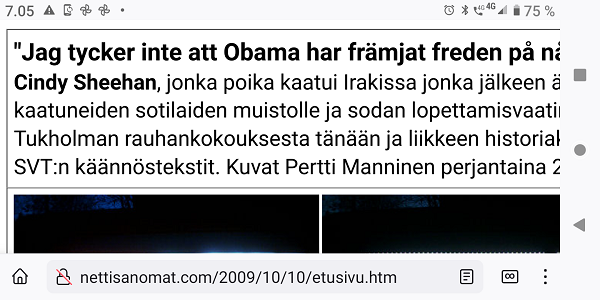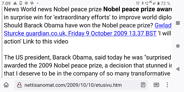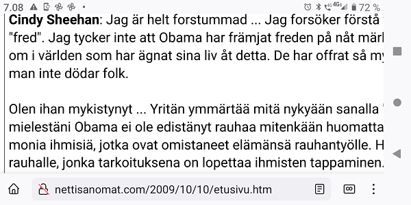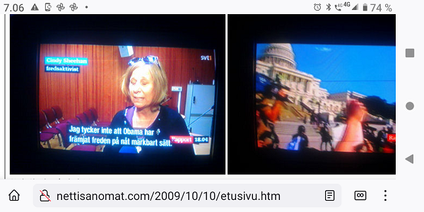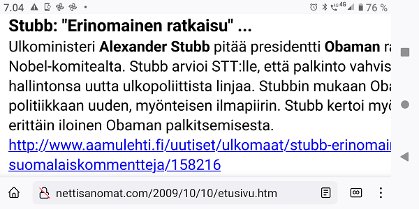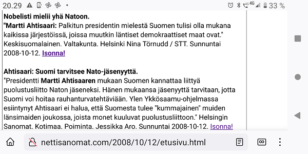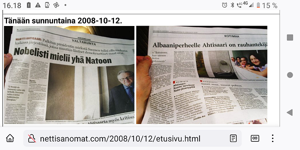 Nettisanomat - Sunnuntai 8.10.2023. Rauhanpalkinto 2008. Martti Ahtisaari Lue! Rauhanpalkinto 2009. Barack Obama Lue! Rauhanpalkinto 2023. Narges Mohammadi Lue! --- Lauantai 7.10.2023. Rauhanpalkinto 2023. Nobelin rauhanpalkinto iranilaiselle naisten oikeuksien puolustajalle. Palkittu Narges Mohammadi on parhaillaan vangittuna Iranissa. Lehtien sivut perjantaina 6.10.2023 15:54- 16:07. --- Perjantai 6.10.2023. 20 vuotta sitten 25.9.2003. Moe haluatko miljönääriksi ohjelman juontajana. By Matti Reijonen Moe 20 vuotta sitten: 2.10.2023 - 3.10.2023 - 4.10.2023 - 5.10.2023 - 6.10.2023 - --- 20 vuotta sitten 2.10.2003. Pääkirjoitus. Puhetta. "Hyvät maanmiehet, tilanne on vakava. - Pääkirjoituksia. Linkit --- Sunnuntai 1.10.2023. Kurjet lentävät. Uusimaa. Kirkkonummi. Lapinkylä. Kuva Pertti Manninen. --- Lauantai 30.9.2023. Nettisanomat lauantai 2006-11-11. Legenda: "Jos sä olet niin helvetin fiksu, niin miksi sä olet niin helvetin köyhä." - Suomen taloushistorian kavalin ja peitellyin pelastusoperaatio, Suomen Yhdyspankin omaisuuden siirtäminen turvaan. Aivoina Björn Wahlroos ja Ahti Hirvonen Lue! --- Veropakolainen Björn Wahlroos vuosien varrelta. Juoksupojasta pomoksi. --- Keskiviikkona 27.9.2023. Päivälleen 24 vuotta sitten: Katujuopottelu kuriin Helsingissä! Viina virtaa vain aidan sisäpuolella? Lue! - 24 vuotta sitten: torstaina elokuun 12. päivänä 1999 Köyhät opiskelijat, painukaa helvettiin! Ette maksa tarpeeksi pankinomistajien tukea! "Kokoomuksen lähtökohtana on ollut tiukka budjettilinja." Ben Zyskowicz. "Jos leikkaus toteutetaan, menettää opiskelijaperhe pahimmillaan yli 7000 markaa vuodessa, keskimäärinkin pitkälti yli 4000 markkaa. Vertti Kiukas. "Pienetkin leikkaukset tuntuvat opiskelijan kukkarossa pahalta, mutta kaikki on suhteellista." Helsingin Sanomien pääkirjoitus, (lehden vastaava päätoimittaja on Janne Virkkunen). ---Tiistaina 26.9.2023. Lähtöä odottaen. Joutsenet pellolla. Uusimaa. Kirkkonummi. Lapinkylä. Maanantai 25.9.2024 15:33. Kuva Pertti Manninen. - Kommentti: Orpo ja Purra yrittävät tökeröä taloustemppua, jolla Reagan ja Thatcherkin saivat aikaan mittavaa vahinkoa. Lue! Kommentti. Jan Hurri. --- Sunnuntaina 24.9.2023. Syksyn lehdet metsäojassa. Uusimaa. Kirkkonummi. Lapinkylä. Sunnuntai 24.9.2024 15:18. Kuva Pertti Manninen. - Näin paljon korkeakoulu- opiskelijoiden talous on heikentynyt: Yliopistoja valtaavien opiskelijoiden huoli on aito. Uusi Suomi. Kommentti. Sonja Mänty. Lue! --- Perjantaina 22.9.2023. Ajankohtaista narutusta? Narutusta Mansessa 2023 Narutusta Moskovassa 2022. - Keskiviikkona 20.9.2023. KALTSIN KALTSIT Valokuvaaja Aulis Nyqvist järjesti kirjaimet riviin ja niin syntyi slangikirja "KALTSIN KALTSIT (Bammailua Kaltsista) tunnelmiin liittyvin valokuvin. - HS: Kirjailija Torsti Lehtinen kuollut lauantaina Helsingissa. Lehtinen oli 81-vuotias. - Keskiviikkona 20.9.2023. Niinistön sanoja ja puheita tulkitaan ja ihmetellään. Ilta-Sanomat tiistai 19.9.2023 --- Maanantaina 18.9.2023. Luottamusta. Ulkomaat Niinistö Putin HS 17.9. - Trump Putin Iltalehti 17.9. - Erdogan Ilta-Sanomat 16.9. - Ardern Støre Marin Trudeau HS 17.9.2023. Kotimaa Orpo Iltalehti 15.9. - Orpo Nettisanomat 20.6. Kuvasarja. - Orpo HS 15.9. - Orpo HS 15.9.2023. Luottamusta. --- Sunnuntaina 17.9.2023. Varrella viikon. Luontokuvia. Maanantaina 11.9.2023. ... Kurjet torstaina 14.9.2023 09:31. Uusimaa. Kirkkonummi. Lapinkylä. ---- Tiistaina 12.9.2023. Teuvo Suomisen vaikuttavat kuvat. --- Maanantaina 11.9.2023. Henrik Meinander: Itseään kunnioittava kansakunta ei siivoa historiaansa katukuvasta. HS Mielipide. 9.9.2023. Lue! --- Sunnuntaina 10.9.2023. Arkisto 2005. Tulossa? 19.03.2005. George W. Bush ja Tony Blair sekä Saddam kahleissa. - Leif Salmén. Kolumni. Taas raha puhuu. Iltalehti keskiviikkona 13.4.2005. --- Perjantaina 8.9.2023. Sanna Marin paholaisen palkkalistoille Pääkirjoitus. Perjantai 8.9.2023 20:01 Kuva. --- Torstaina 7.9.2023. Arkistokuvat: Helsinki 1952: "Jenkkineekeri ei kuitenkaan saa sisään lopullista tyrmäysiskua". --- Maanantaina 4.9.2023. Narutusta Mansessa 2023. - Narutusta Moskovassa 2022 "... että Suomen ja Ruotsin taustalla naruista vetelee Yhdysvallat." -20 vuotta sitten 4.9.2003 - Hän ottaa vastuun - mutta mistä? Blair - Bergholm: Jäähyväiset Lipposelle! - Sarjakuva! Moe Ranskassa. Lue! --- Torstaina 31.8.2023. Monenlaisia ihmisiä asemalla. - Epätäydellinen maailma. Ylen A-talk torstaina 31.8.2023 21:05. Rasismikeskustelu puheentunnitusohjelmalla. --- Maanantaina 28.8.2023. Hetki: Kurjet lentävät. Lauantaina 27.8.2023 15:22. - Nettisanomat 20 vuotta sitten 28.8.2003. Helsinki 2003. Hirmuiset helteet jatkuvat. - Irak. - "Stop Women's Abduction & Killing". Raiskaukset kuuluvat Irakin arkipäivään. Bagdad. - Nettisanomat 20 vuotta sitten 28.8.2003. I have a dream. - Kuka hän on? - Nettisanomat 20 vuotta sitten 28.8.2003. - Pääkirjoitus. Onko mikään muuttunut? IS esittelee Niinistön uuden naisystävän. --- Torstaina 24.8.2023. Putin vs Prigožin. - Arkisto. Nettisanomat 20 vuotta sitten 21.8.2003. --- Keskiviikkona 16.8.2023. Arkisto 20 vuotta sitten 14.8.2003. - USA. Hullut vaalit. - Valtauksen merkki. Vaikea kuva 2003. 10.04.2003. Kaleva. - Ahtisaari ei kaipaa todisteita. 01.08.2003. --- Tiistaina 15.8.2023. Tanssi yli hautojen. Tanssi yli hautojen. - Ilta-Sanomat tiistaina 15.8.2023: Uutuuskirja: Aselepo ennen kuolemaa. Niinistön ja Kanervan koskettava kohtaaminen. Kuva: tiistaina 15.8.2023 08:59. Pertti Manninen. Pääkirjoitus. Tanssi yli hautojen. --- Maanantaina 14.8.2023. Jätskiautolla. Kuva. --- Sunnuntaina 13.8.2023. Uusi sukupolvi hippasilla. Kuva. --- Torstaina 10.8.2023. Koulut alkoivat. Matkakuvia. Kuvat. --- Talous. Kone sai Partekin puoli-ilmaiseksi. --- Rallikuvia 2011. --- Alastomuutta. - --- Nettisanomat 20 vuotta sitten 22.5.2003. --- - Arkisto 6.9.2001. Pääkirjoitus. --- SYYSKUU 2016. ORAVA TAMMESSA. - Vuosisadan kuva: Sirkka Hämäläinen, Sauli Niinis