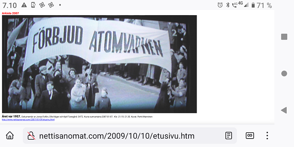 Kuvia sunnuntaina 2007-01-07. Året var 1957. Dokumentär av Jonas Fohlin, Olle Häger och Kjell Tunegård. SVT2. "Förbjud atomvapnen", Uimarannalla ja Professori elokuvasta Mansikkapaikka .Igmar Bergman 1957. Ohjelmassa näytettiin myös Laika-koira, ensimmäinen elävä olento avaruudessa. Vuosi oli 1957. Klo 21.15- 21.35. Kuvat. Pertti Manninen. |