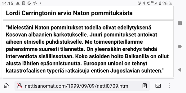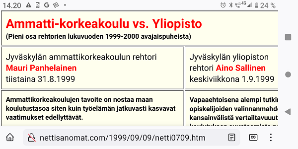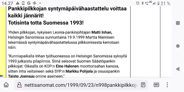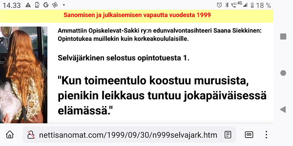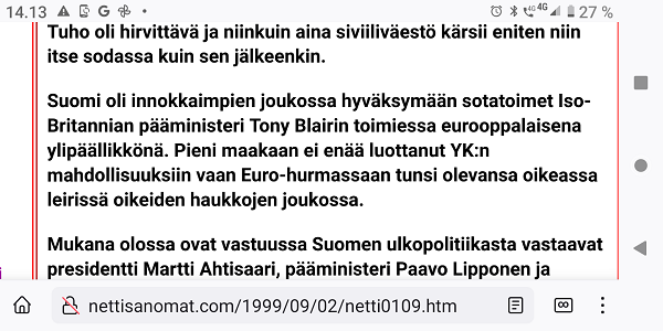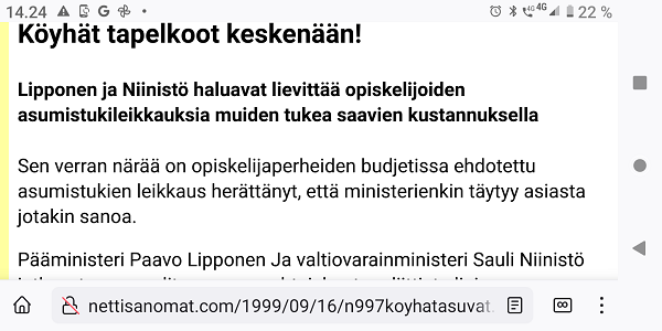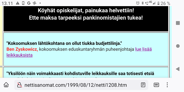 Nettisanomat - Sunnuntaina 8.10.2023. Nettisanomia heinäkuulta 1999 - elokulta 1999 - syyskuulta 1999. --- Arkisto. Keskiviikkona 27.9.2023. Selkänahka vaarassa! Lisää Leikkauksia tulossa? 12.8.1999- - Arkistosta 1999. Opiskelijoiden kurmuutus. Kurmuuttajat: 12.8.1999. Ben Zyskowicz, kokoomuksen eduskuntaryhmän puheenjohtaja Lue! 12.8.1999. Janne Virkkunen, Helsingin Sanomien vastaava päätoimittaja Lue! 16.9.1999. Paavo Lipponen, pääministeri Lue! 16.9.1999. Sauli Niinistö, valtiovarainministeri Lue! 16.9.1999. Ben Zyskowicz, kokoomuksen eduskuntaryhmän puheenjohtaja Lue! 16.9.1999. Suvi Linden, kulttuuriministeri Lue! 30.9.1999. Pekka Kettunen, Jyväskylän kaupunginjohtaja Lue! 30.9.1999. Suvi Linden, opetusministeri Lue! Puolustajat: 12.8.1999. Vertti Kiukas, Helsingin yliopiston ylioppilaskunnan hallituksen jäsen Lue! 30.9.1999. Saana Siekkinen, Ammattiin Opiskelevat-Sakki ry:n edunvalvontasihteeri Lue! - 24 vuotta sitten: torstaina elokuun 12. päivänä 1999 Köyhät opiskelijat, painukaa helvettiin! Ette maksa tarpeeksi pankinomistajien tukea! "Kokoomuksen lähtökohtana on ollut tiukka budjettilinja." Ben Zyskowicz, kokoomuksen eduskuntaryhmän puheenjohtaja lue lisää leikkauksista "Yksilöön näin voimakkaasti kohdistuville leikkauksille saa totisesti etsiä vertailukohtia sosiaaliturvamme historiasta." "Jos leikkaus toteutetaan, menettää opiskelijaperhe pahimmillaan yli 7000 markaa vuodessa, keskimäärinkin pitkälti yli 4000 markkaa. Vertti Kiukas, Helsingin yliopiston ylioppilaskunnan hallituksen jäsen lue lisää hallitusohjelmapetoksesta "Pienetkin leikkaukset tuntuvat opiskelijan kukkarossa pahalta, mutta kaikki on suhteellista." Helsingin Sanomien pääkirjoitus, (lehden vastaava päätoimittaja on Janne Virkkunen). lue lisää leikkauksista. ---Tiistaina 26.9.2023. Lähtöä odottaen. Joutsenet pellolla. Uusimaa. Kirkkonummi. Lapinkylä. Maanantai 25.9.2024 15:33. Kuva Pertti Manninen. - Kommentti: Orpo ja Purra yrittävät tökeröä taloustemppua, jolla Reagan ja Thatcherkin saivat aikaan mittavaa vahinkoa. Lue! Kommentti. Jan Hurri. Ilta-Sanomat Taloussanomat Sunnuntai 24.9.2023. Lue! "Tulonsiirrot köyhiltä rikkaille ovat tökeröä politiikkaa, mutta ne eivät ole Orpon tai Purran keksintöä. Samaa kokeilivat jo 1980-luvun ”suuret talous-uudistajat" Reagan ja Thatcher – surkein seurauksin." --- Sunnuntaina 24.9.2023. Syksyn lehdet metsäojassa. Lehdet ja risut odottavat talvea ja kevättä muhentaakseen uutta voimaa seuraavalle kesälle. Uusimaa. Kirkkonummi. Lapinkylä. Sunnuntai 24.9.2024 15:18. Kuva Pertti Manninen. - Näin paljon korkeakoulu- opiskelijoiden talous on heikentynyt: Yliopistoja valtaavien opiskelijoiden huoli on aito. Uusi Suomi. Kommentti. Sonja Mänty. Lue! --- Perjantaina 22.9.2023. Ajankohtaista narutusta? Narutusta Mansessa 2023 Narutusta Moskovassa 2022. - Keskiviikkona 20.9.2023. KALTSIN KALTSIT Valokuvaaja Aulis Nyqvist järjesti kirjaimet riviin ja niin syntyi slangikirja "KALTSIN KALTSIT (Bammailua Kaltsista) tunnelmiin liittyvin valokuvin. - HS: Kirjailija Torsti Lehtinen kuollut Kirjailija, filosofi ja kääntäja Torsti Lehtinen on kuollut lauantaina Helsingissa. Lehtinen oli 81-vuotias. Ylen tekstitv tiistaina 19.9.2023 16:20 Tuuli käy heidän ylitseen. RIP Torsti. Pertti Manninen. - Keskiviikkona 20.9.2023. Niinistön sanoja ja puheita tulkitaan ja ihmetellään. Ilta-Sanomat tiistai 19.9.2023 Venäjän media kuhisee ERIKOISIA TULKINTOJA NIINISTÖN SANOISTA Iltalehti tiistai 19.9.2023 Huippuasiantuntija IHMETTELEE NIINISTÖN YDINASEPUHEITA. --- Maanantaina 18.9.2023. Luottamusta. Ulkomaat Niinistö Putin HS 17.9. - Trump Putin Iltalehti 17.9. - Erdogan Ilta-Sanomat 16.9. - Ardern Støre Marin Trudeau HS 17.9.2023. Kotimaa Orpo Iltalehti 15.9. - Orpo Nettisanomat 20.6. Kuvasarja. - Orpo HS 15.9. - Orpo HS 15.9.2023. Luottamusta. --- Sunnuntaina 17.9.2023. Varrella viikon. Luontokuvia. Maanantaina 11.9.2023. ... Kurjet torstaina 14.9.2023 09:31. Uusimaa. Kirkkonummi. Lapinkylä. ---- Tiistaina 12.9.2023. Teuvo Suomisen vaikuttavat kuvat. Teuvo Suomisen vaikuttavat kuvat. Viisi vuosikymmentä kantaaottavan luonnonvalokuvan historiaa. --- Maanantaina 11.9.2023. Henrik Meinander: Itseään kunnioittava kansakunta ei siivoa historiaansa katukuvasta. HS Mielipide. 9.9.2023. Lue! - Arkisto 2022. Perjantai 27.5.2022. Lenin sai kyytiä Turusta. Turun kaupunginjohtaja Minna Arve (kok), Petteri Orpo, - 2011: Siittimen palautus Rakveressa. Kuvasarja! --- Sunnuntaina 10.9.2023. Arkisto 2005. Tulossa? 19.03.2005. George W. Bush ja Tony Blair sekä Saddam kahleissa. - Leif Salmén. Kolumni. Taas raha puhuu. Iltalehti keskiviikkona 13.4.2005. --- Perjantaina 8.9.2023. Sanna Marin paholaisen palkkalistoille Pääkirjoitus. Perjantai 8.9.2023 20:01 Kuva. --- Torstaina 7.9.2023. Arkistokuvat: Helsinki 1952: "Jenkkineekeri ei kuitenkaan saa sisään lopullista tyrmäysiskua". --- Maanantaina 4.9.2023. Narutusta Mansessa 2023. - Narutusta Moskovassa 2022 "... että Suomen ja Ruotsin taustalla naruista vetelee Yhdysvallat." -20 vuotta sitten 4.9.2003 - Hän ottaa vastuun - mutta mistä? Blair - Bergholm: Jäähyväiset Lipposelle! - Sarjakuva! Moe Ranskassa. Lue! --- Torstaina 31.8.2023. Monenlaisia ihmisiä asemalla. - Epätäydellinen maailma. Ylen A-talk torstaina 31.8.2023 21:05. Rasismikeskustelu puheentunnitusohjelmalla. --- Maanantaina 28.8.2023. Hetki: Kurjet lentävät. Lauantaina 27.8.2023 15:22. - Nettisanomat 20 vuotta sitten 28.8.2003. Helsinki 2003. Hirmuiset helteet jatkuvat. - Irak. - "Stop Women's Abduction & Killing". Raiskaukset kuuluvat Irakin arkipäivään. Bagdad. - Nettisanomat 20 vuotta sitten 28.8.2003. I have a dream. - Kuka hän on? - Nettisanomat 20 vuotta sitten 28.8.2003. - Pääkirjoitus. Onko mikään muuttunut? IS esittelee Niinistön uuden naisystävän. --- Torstaina 24.8.2023. Putin vs Prigožin. - Arkisto. Nettisanomat 20 vuotta sitten 21.8.2003. --- Keskiviikkona 16.8.2023. Arkisto 20 vuotta 