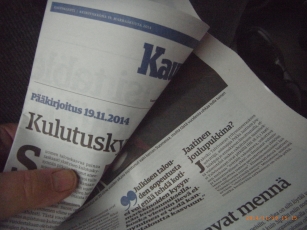 Linja-automatkalla koululaisia ja lehteä tarkkaillen keskiviikkona 19.11.2014 iltapäivällä 14:08 - 14:24. Siivoton pysäkki - Pyörätytöt - Järvimaisema - KL: Ylen verkkouutiset saavat mennä - Jaatinen joulupukkina - Nokian tabletti on yhtiölle riskitön hanke - Rahaa kassaan voisulaa juoden - Ilpo Kokkila: SRV on maksanut poikkeuksellisen paljon veroja - Pienryhmien diktatuuri on ottanut vallan - Mopotyttö - Koulukuljetukset - Sanoma ja Stockmann laskuputkessa. Keski-Suomi. Laukaa. Keskusta ja Vihtavuori. Keskiviikkona 19.11.2014. Kuvien kello elää vielä talviaikaa! Raw-kuvat: Pertti Manninen. Isonna! (LAAJA) |